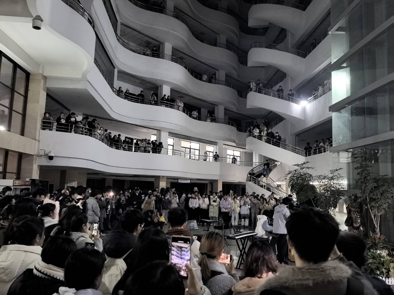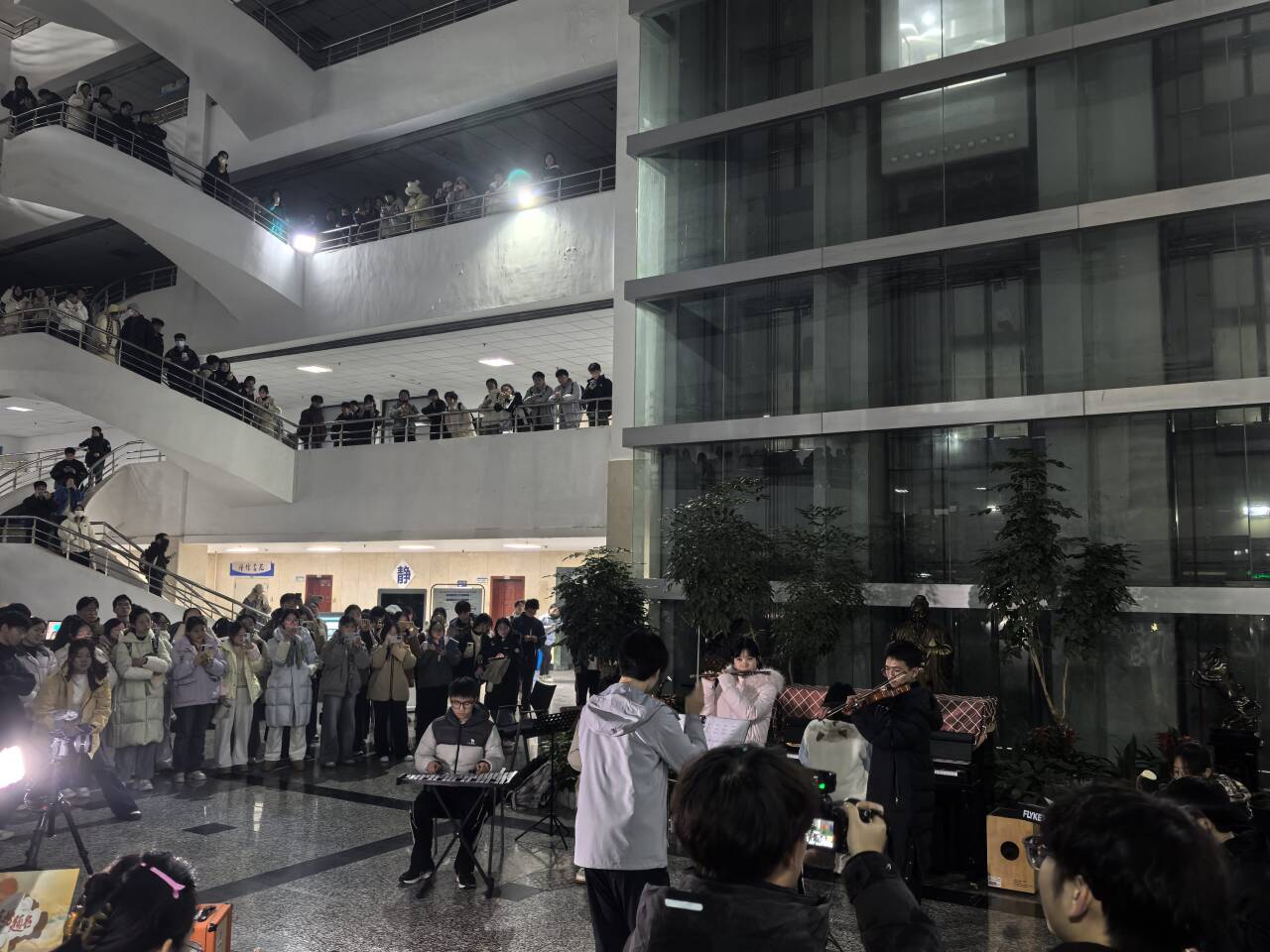 周四晚闭馆时,图书馆与团委艺术团联手演奏《如愿》、《世界赠与我的》、《一路生花》等暖心曲目,悠扬旋律舒缓备考压力。