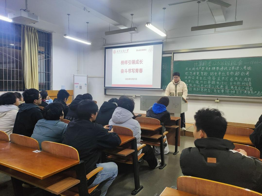 为充分发挥榜样示范作用,激励广大青年学子坚定理想、奋发向上,12月21日,计算机学院组织召开了“榜样引领成长,奋斗书写青春”主题班会,此次班会聚焦思想引领与成长激励,通过理论研习、政策解读与风采展示相结合的形式,引导同学们明确方向、汲取力量,营造了崇尚先进、学习先进、争当先进的浓厚氛围。