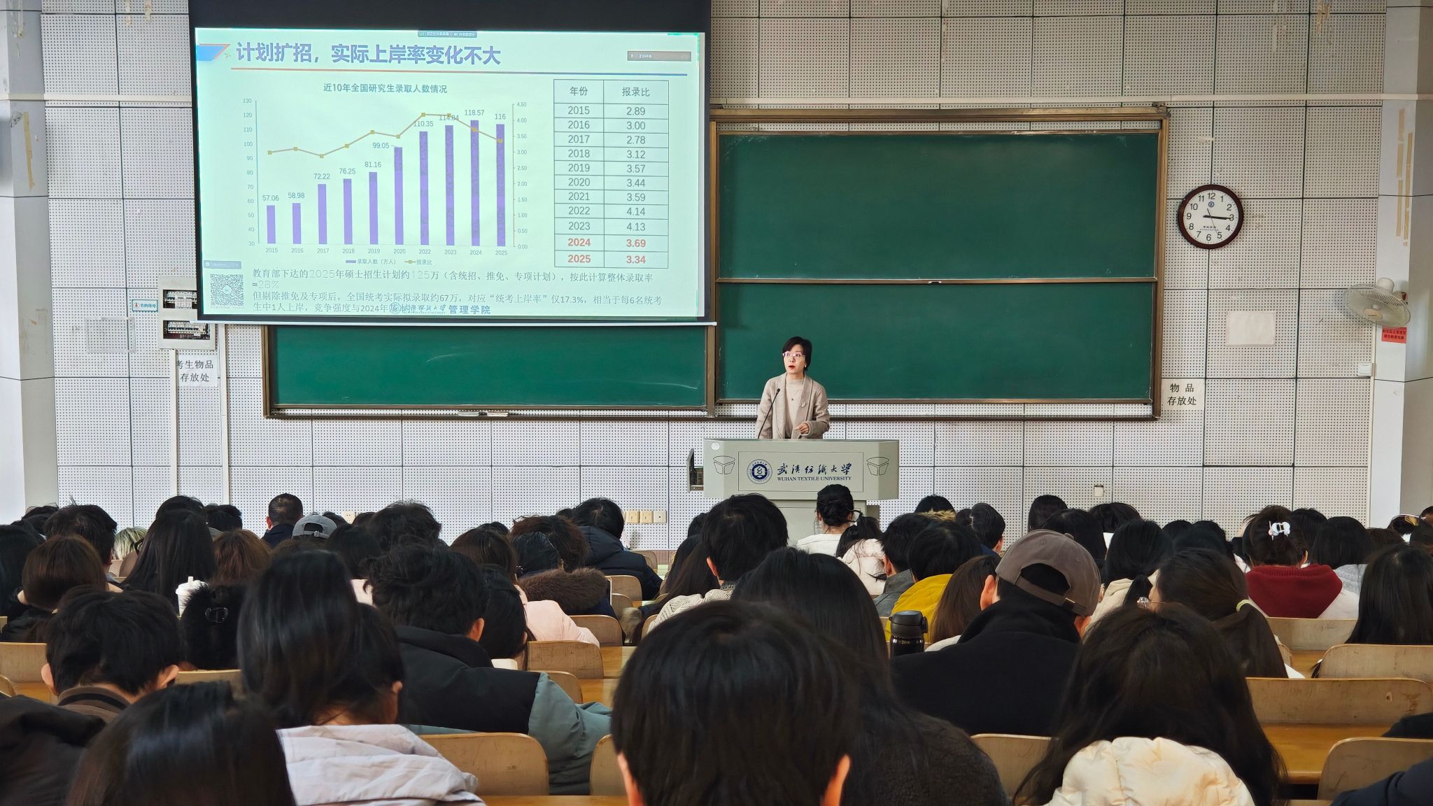 杨筝以“智慧管院 研途有你”为主题开展考研专题指导。她结合当前考研整体形势,从课程分数提升的关键要点、考研信息收集的有效渠道、目标院校选择的核心逻辑等方面进行细致讲解,同时针对复习阶段的时间规划、科目搭配、心态调节等实用问题给出具体建议,帮助同学们清晰认知考研流程中的重点与难点,为备考起步夯实基础。