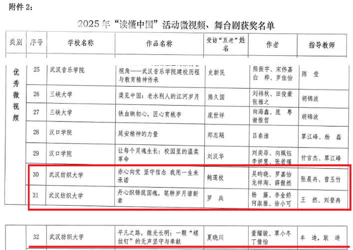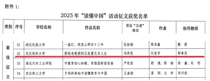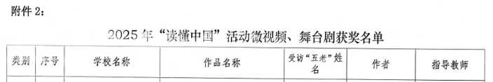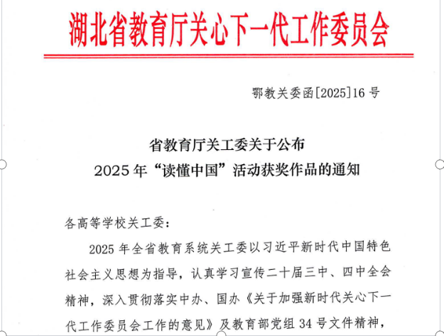 日前,根据《省教育厅关工委关于公布2025年“读懂中国”活动获奖作品的通知》(鄂教关委函〔2025〕16号),学校荣获省教育厅关工委2025年“读懂中国”活动多项荣誉,成为湖北省16个教育部表扬单位之一。