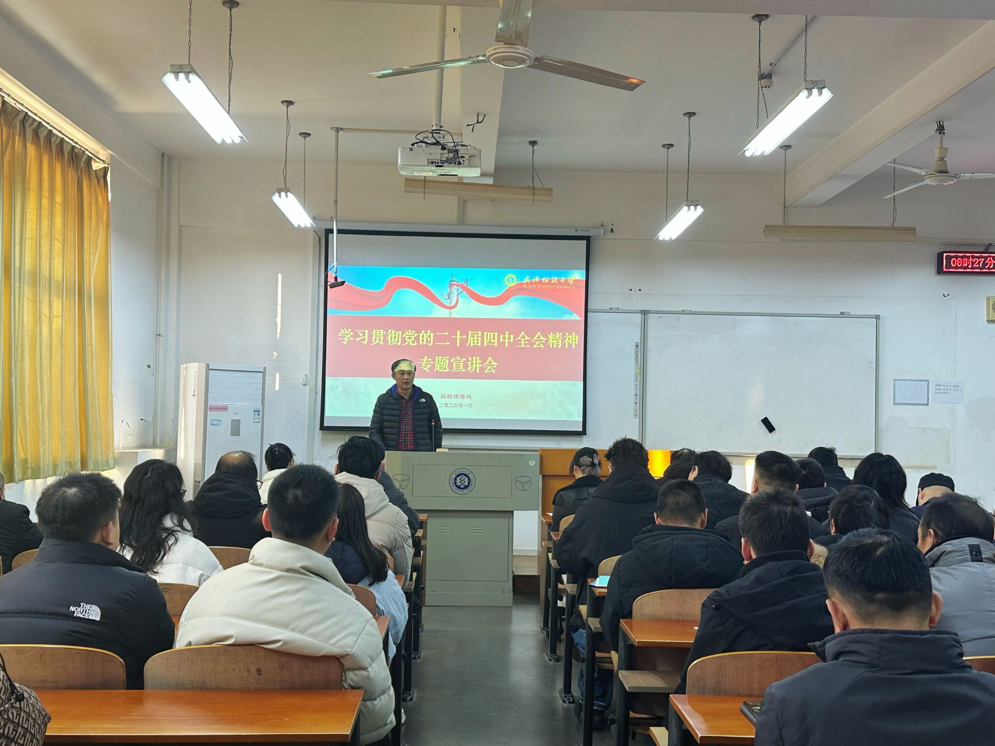 1月13日上午,后勤处在阳光校区崇志楼101室组织召开党的二十届四中全会精神专题宣讲会。会议由后勤党委书记卫冬妹主讲,后勤党委宣传委员杨卫国主持,处领导班子成员、全体中心主任、阳光校区全体党员和正式职工以及经理级编制外员工参加会议。