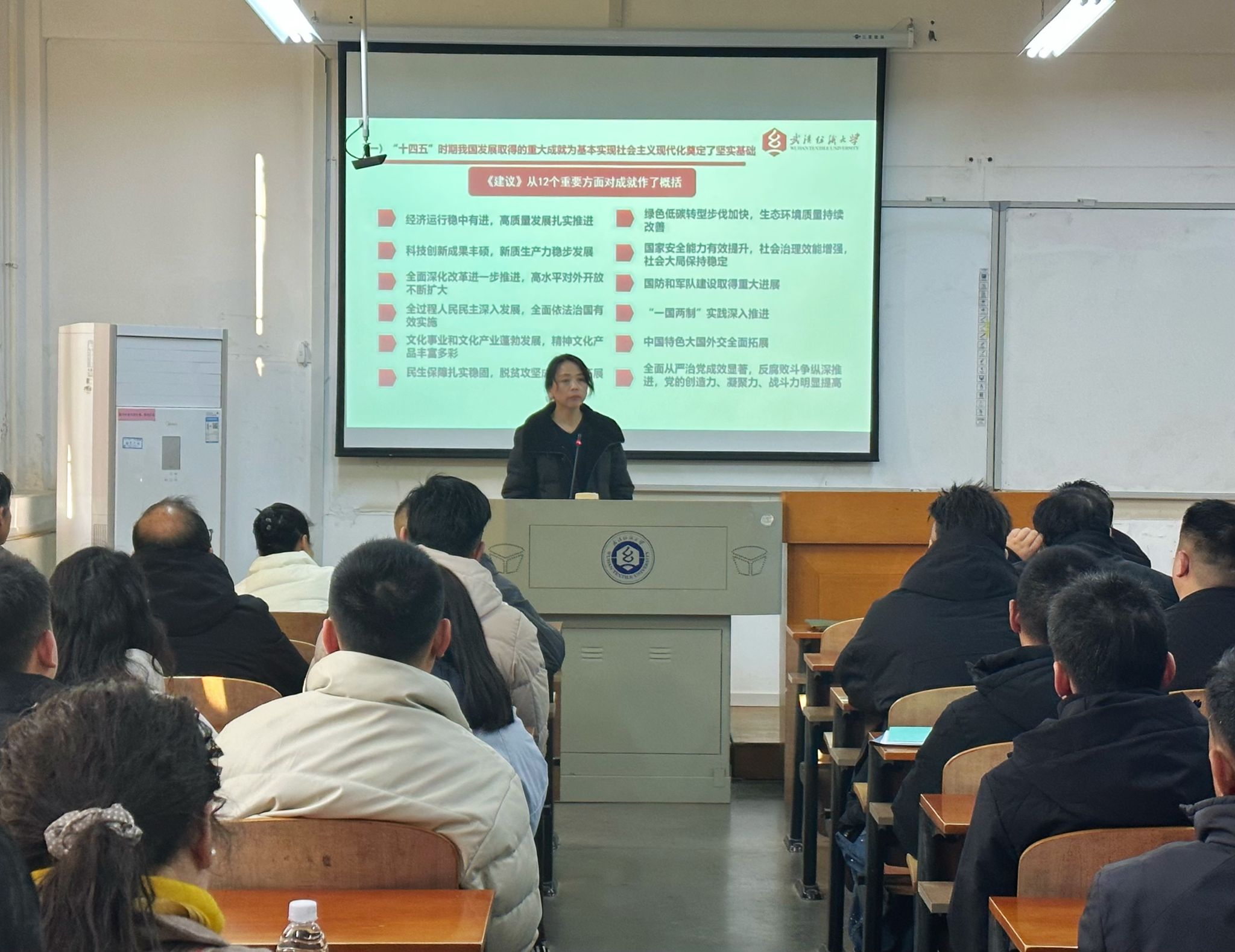 卫冬妹重点梳理了“十四五”时期我国在经济、科技、民生等12个方面取得的重大成就,详细阐释了“十五五”时期经济社会发展的指导方针、“六个坚持”重大原则和主要目标,并结合学校后勤工作实际,对全会提出的战略任务和重大举措进行了针对性解读。她强调,后勤工作是学校高质量发展的重要保障,要深刻践行“坚持人民至上”“大力发展全过程人民民主”理念,深刻领悟“两个确立”的决定性意义,立足后勤服务岗位,强化责任担当,持续提升服务质量和保障能力,为学校事业发展和中国式现代化建设贡献后勤保障力量。