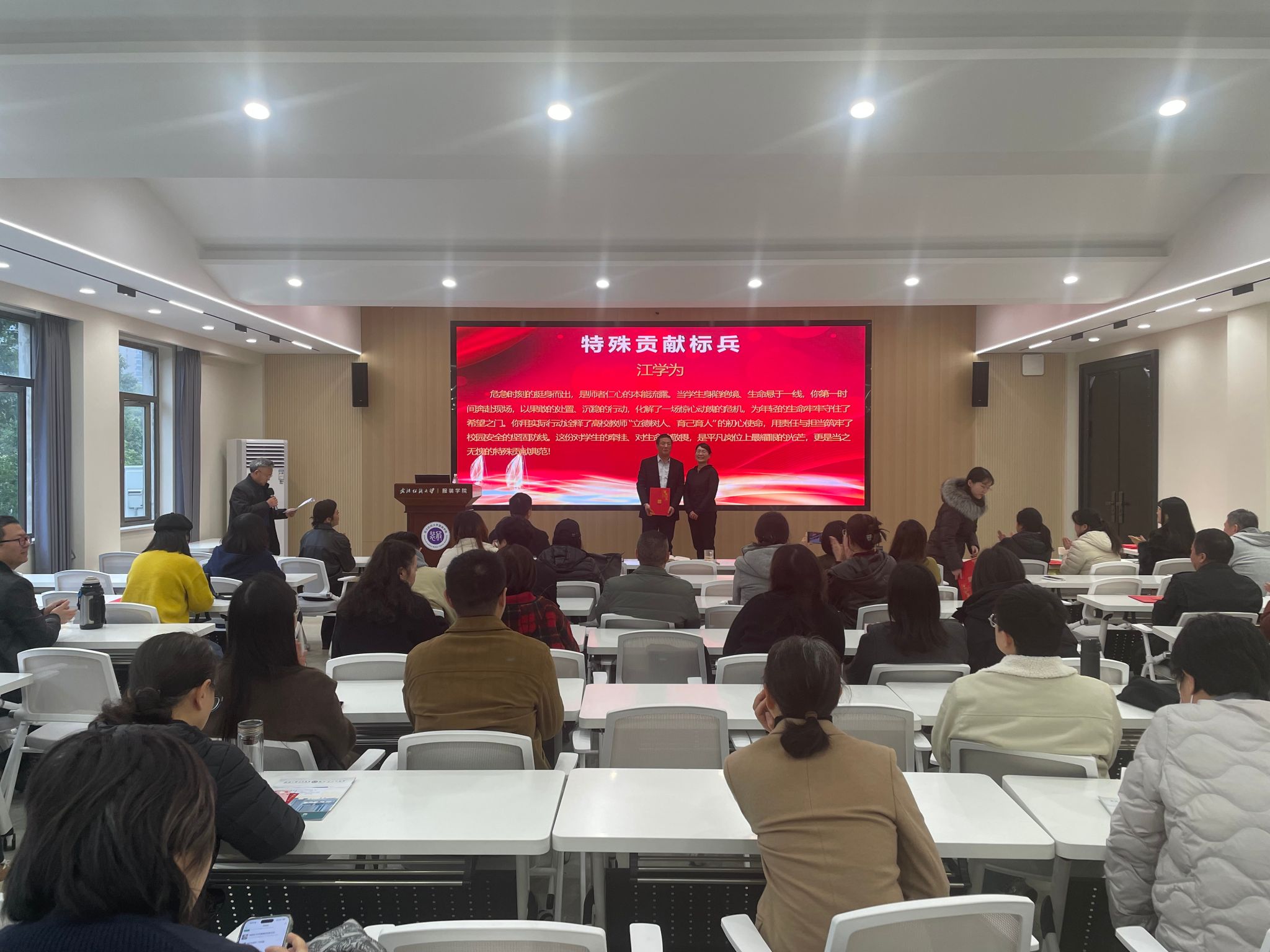 ( 院长陶辉为学院特殊贡献标兵颁奖 )