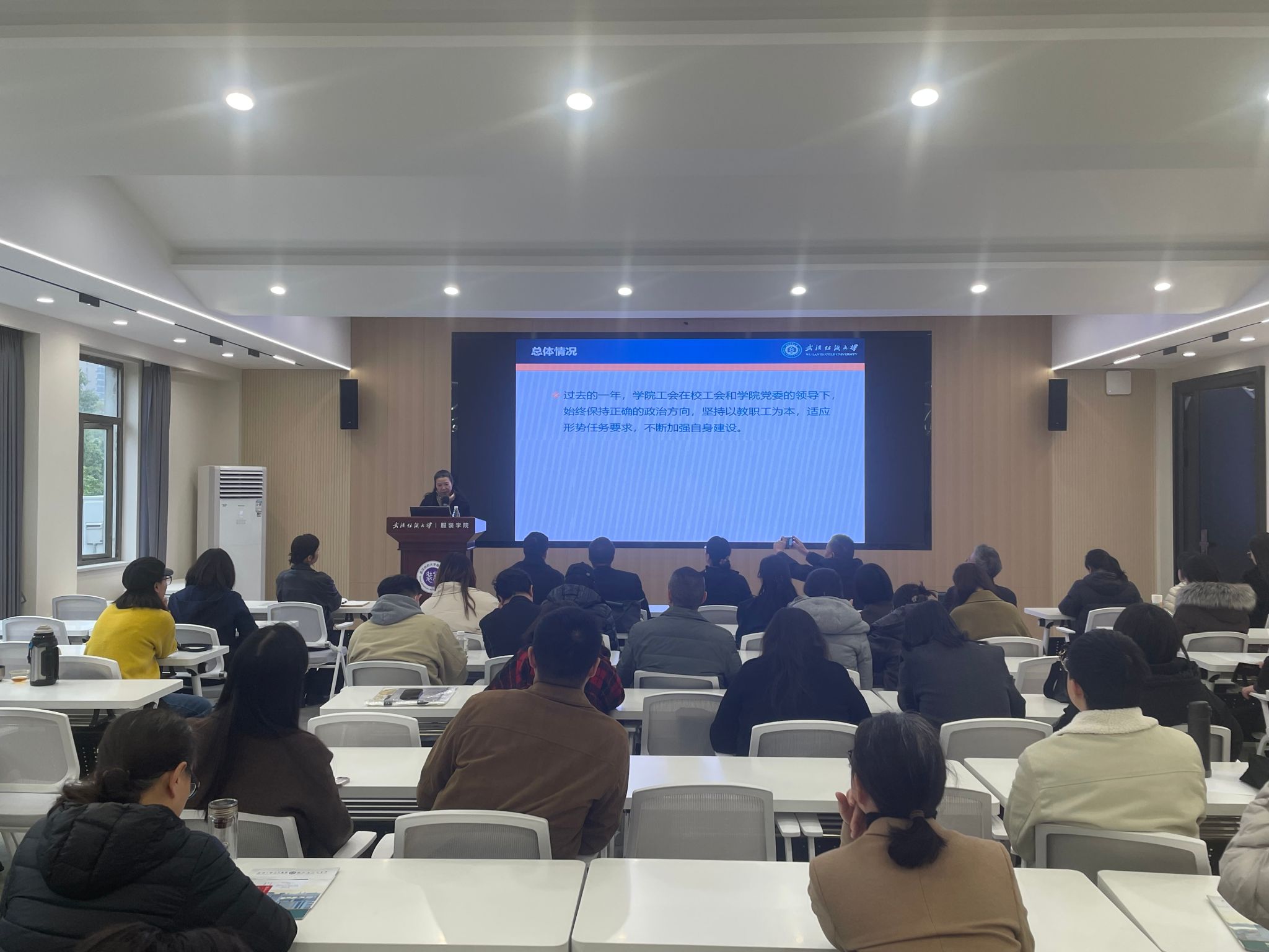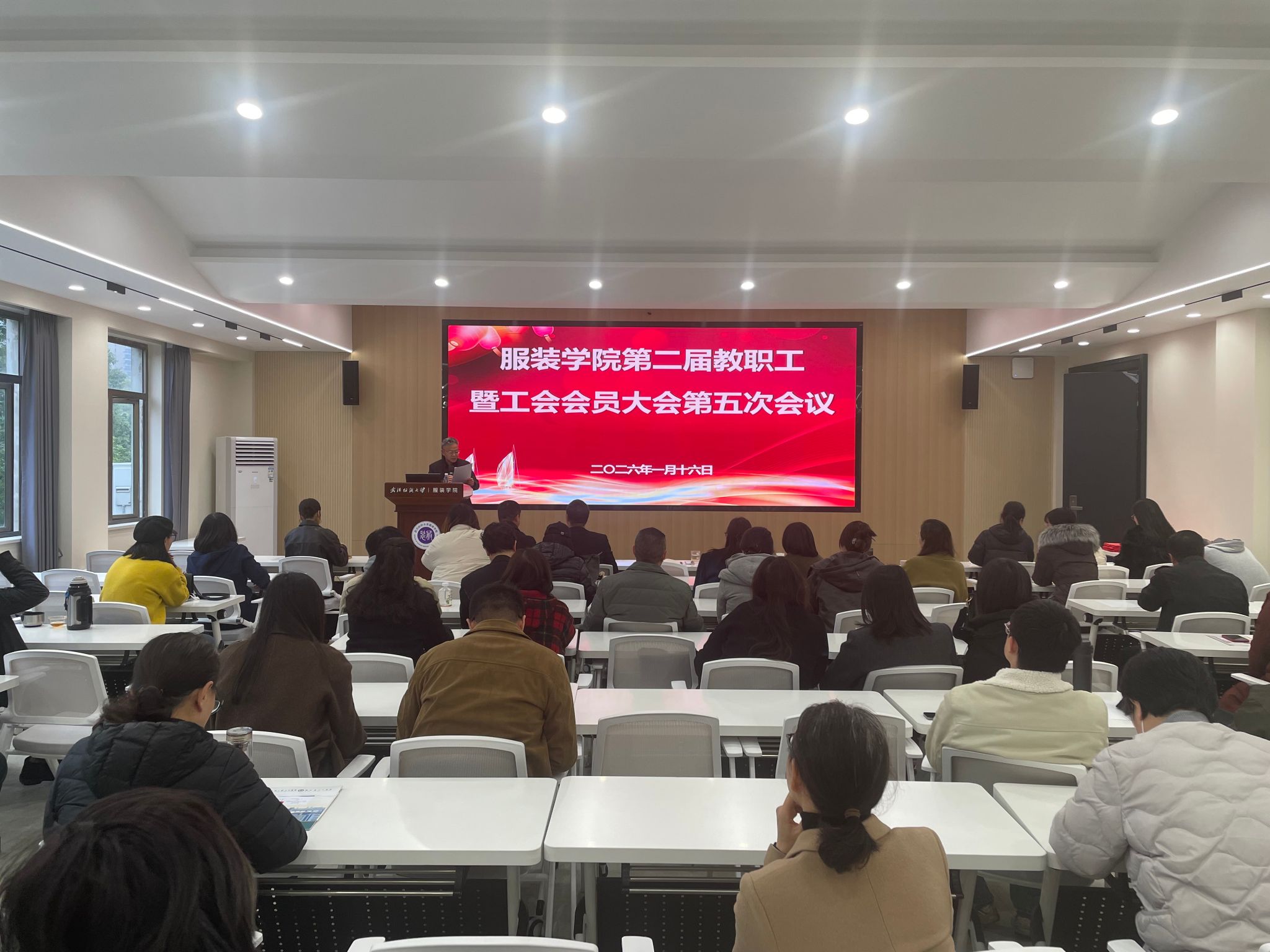 1月16日下午,伴随着庄严的国歌声,服装学院第二届教职工暨工会会员大会第五次会议于南湖校区尚知楼211多功能报告厅顺利召开。校工会常务副主席肖迪明、学院全体领导班子出席大会,全体教职工参加本次会议。大会由服装学院党委书记杜新年主持。