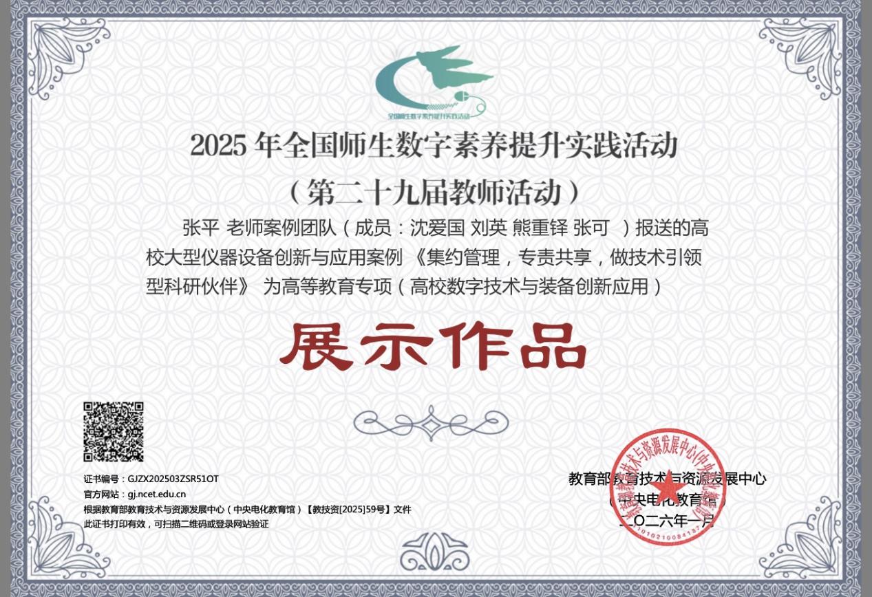 近日, 2025年全国师生数字素养提升实践活动评选结果揭晓,分析测试中心张平等老师报送的高校大型仪器设备创新与应用案例《集约管理,专责共享,做技术引领型科研伙伴》榜上有名,成功入选高等教育专项展示作品,该案例类型全省仅有4项获殊荣。