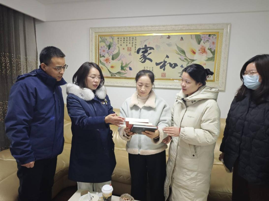 家访结束后,老师们向杨同学赠送了《习近平与他的大学生朋友》《习近平的七年知青岁月》及《航空航天纺织品探秘》三本书籍,并勉励她牢记纺大人的身份与使命,珍惜时光、夯实学业、勇敢追梦。