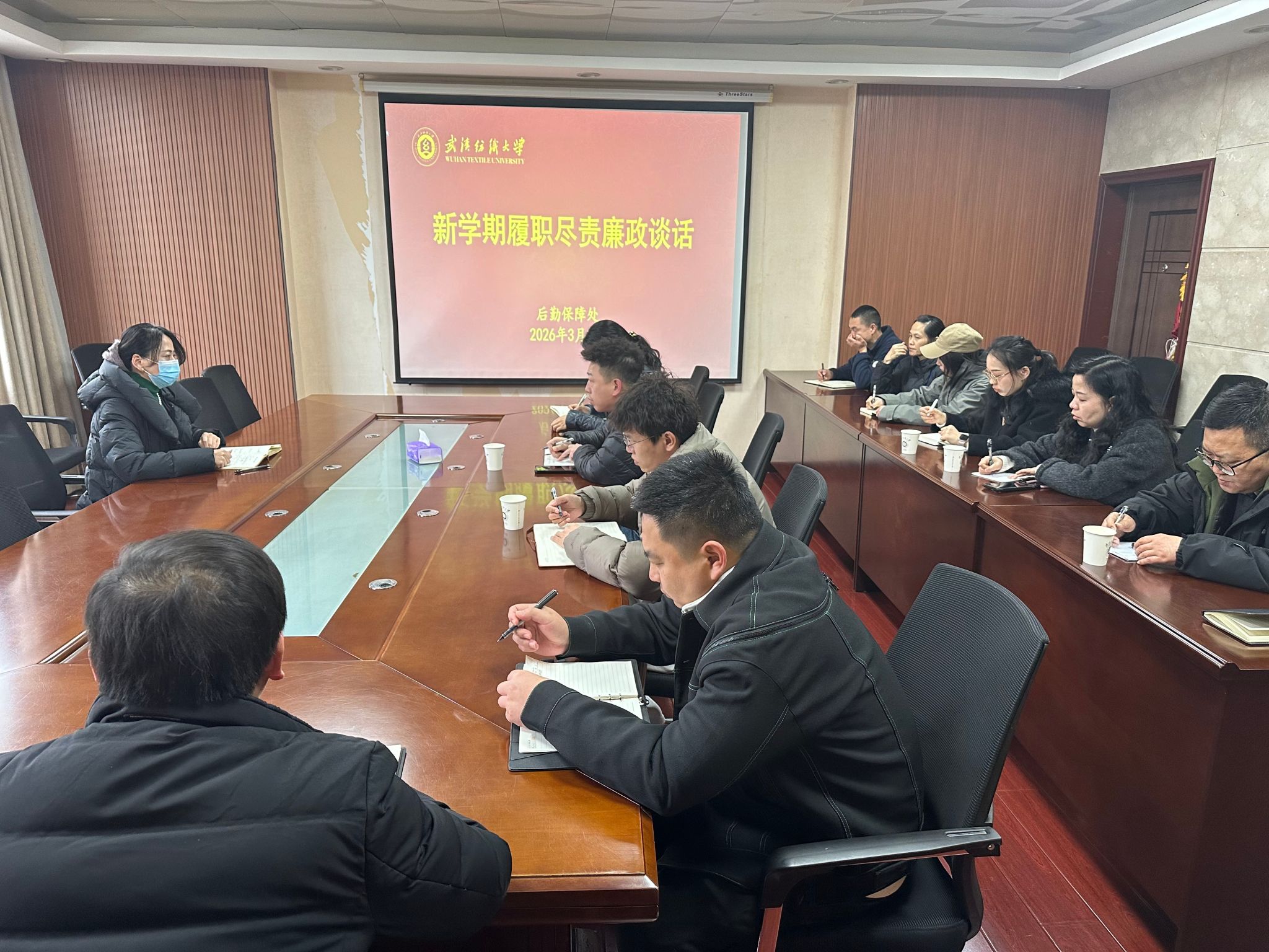 3月1日下午,后勤处党委书记卫冬妹与分管部门负责人及部门员工进行了全覆盖式履职尽责和廉政谈话。此次谈话旨在敲响廉政警钟,拧紧责任螺丝,为新学期后勤服务保障工作筑牢思想根基。