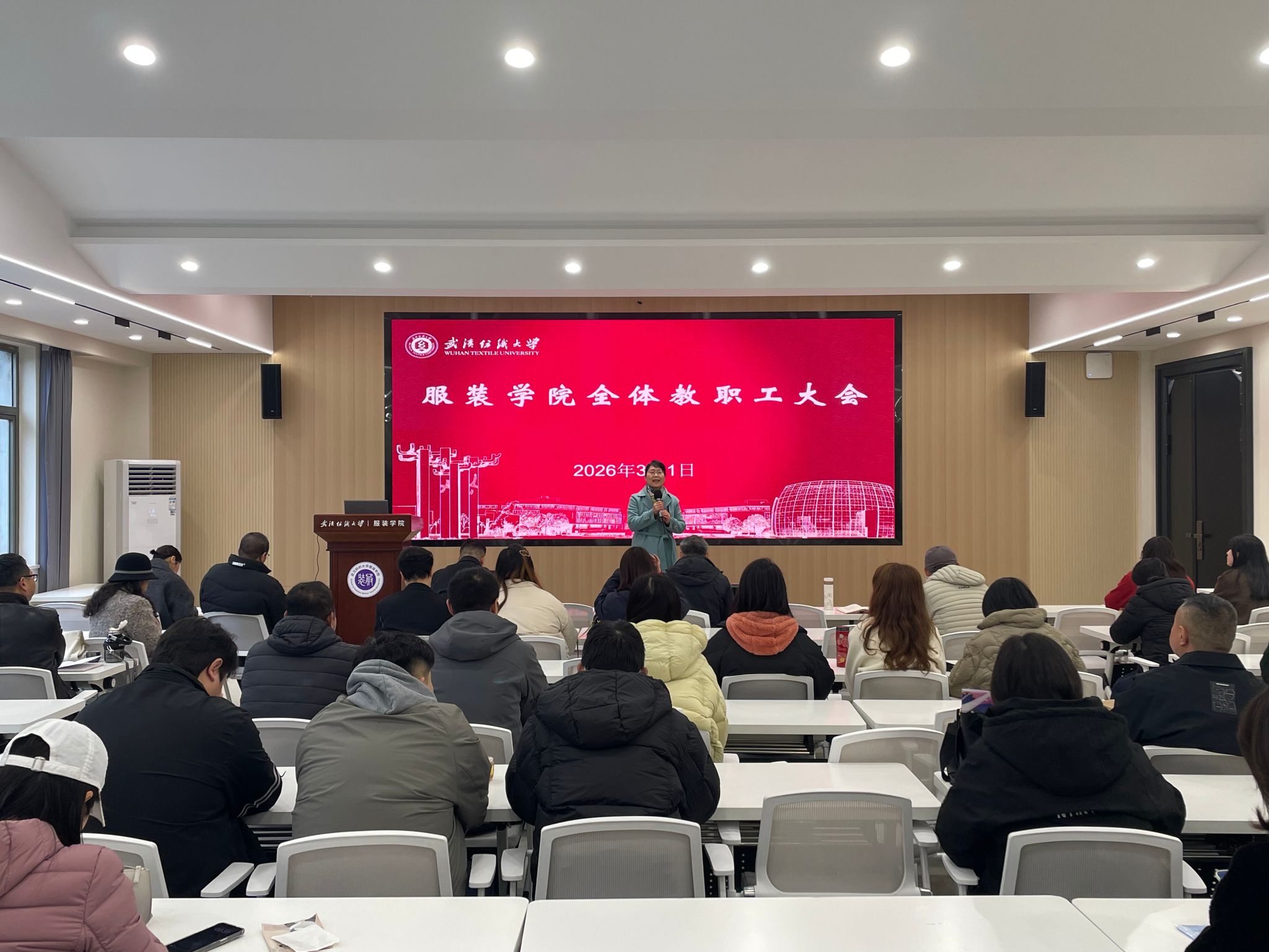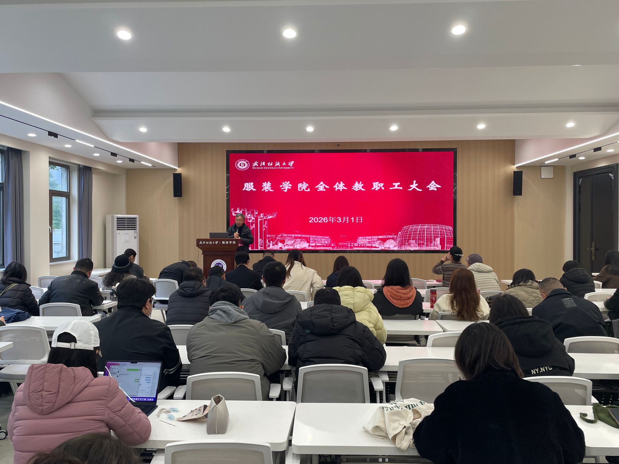为统筹推进新学期各项工作开展,进一步统一思想、压实责任,为学院高质量发展和学校 “双一流” 建设筑牢根基,服装学院于3月1日上午,在尚知楼211报告厅召开全体教职工大会。学院领导班子成员及全体教职工参会,会议由院长陶辉主持,围绕师德师风建设、教学科研、人才培养、安全管理等核心工作系统部署新学期重点任务,为新学期工作开好局、起好步明确方向。