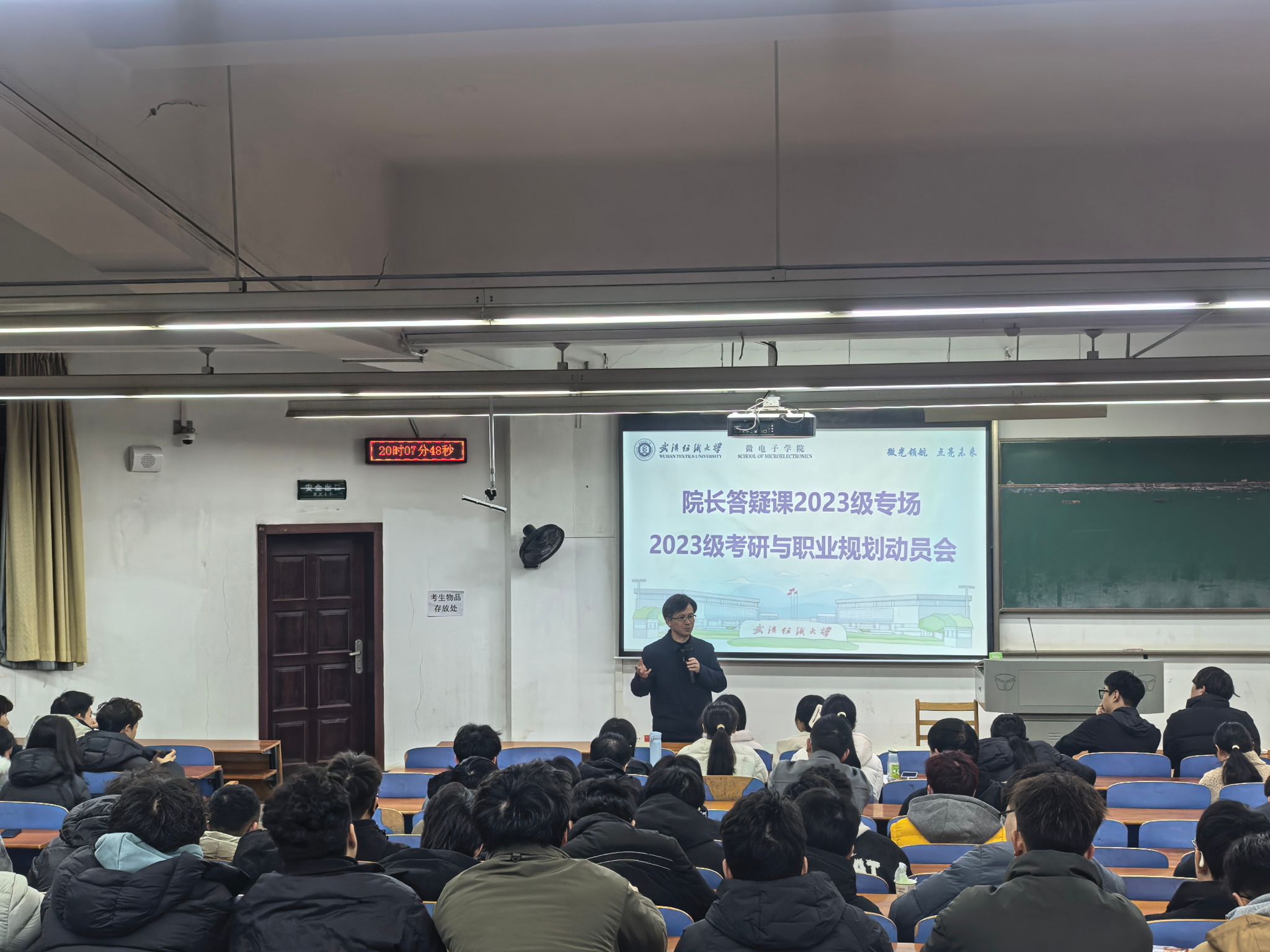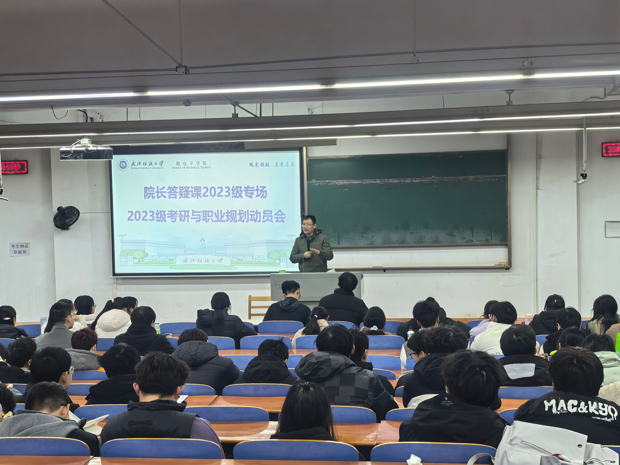 为了引导2023级微电学子做好职业规划和就业方向选择,调动学生考研热情,3月5日晚,微电子学院副院长(主持工作)何云斌教授在崇志楼T102阶梯教室开展了“2023级考研与职业规划”专题院长答疑课。本次答疑课由微电子学院党总支副书记古江波博士主持,2023级辅导员和全体学生参与。