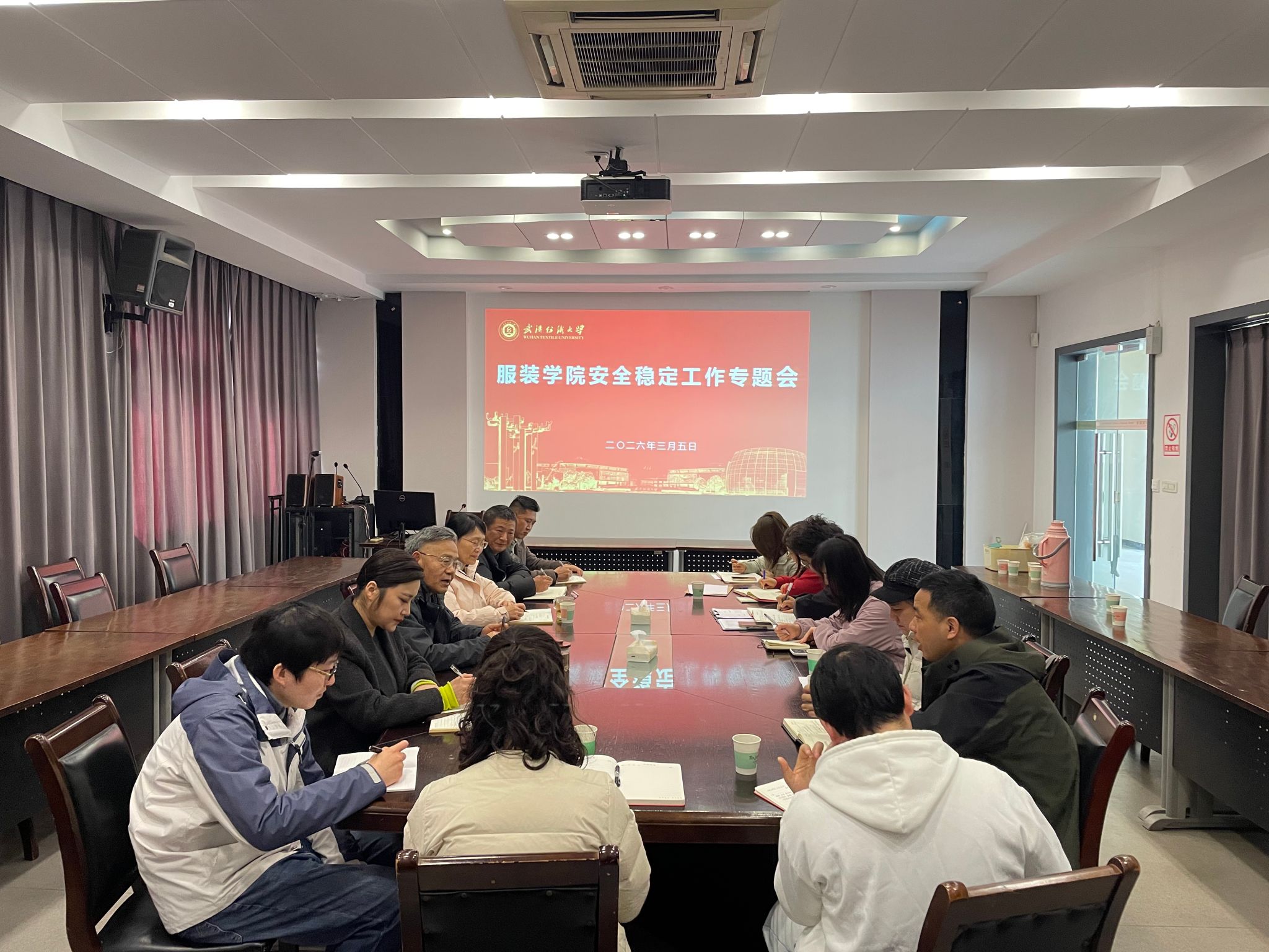 为进一步筑牢校园安全稳定防线,压实各环节工作责任,统筹推进安全管理与人才培养深度融合,服装学院于3月5日下午,在服装学院尚知楼三楼会议室召开安全稳定工作专题会。学院领导班子成员、院办、实验室相关负责人以及全体辅导员参会,会议围绕学生管理、教学科研、校园安全等重点领域的安全稳定工作进行全面部署,细化工作举措,明确责任要求。