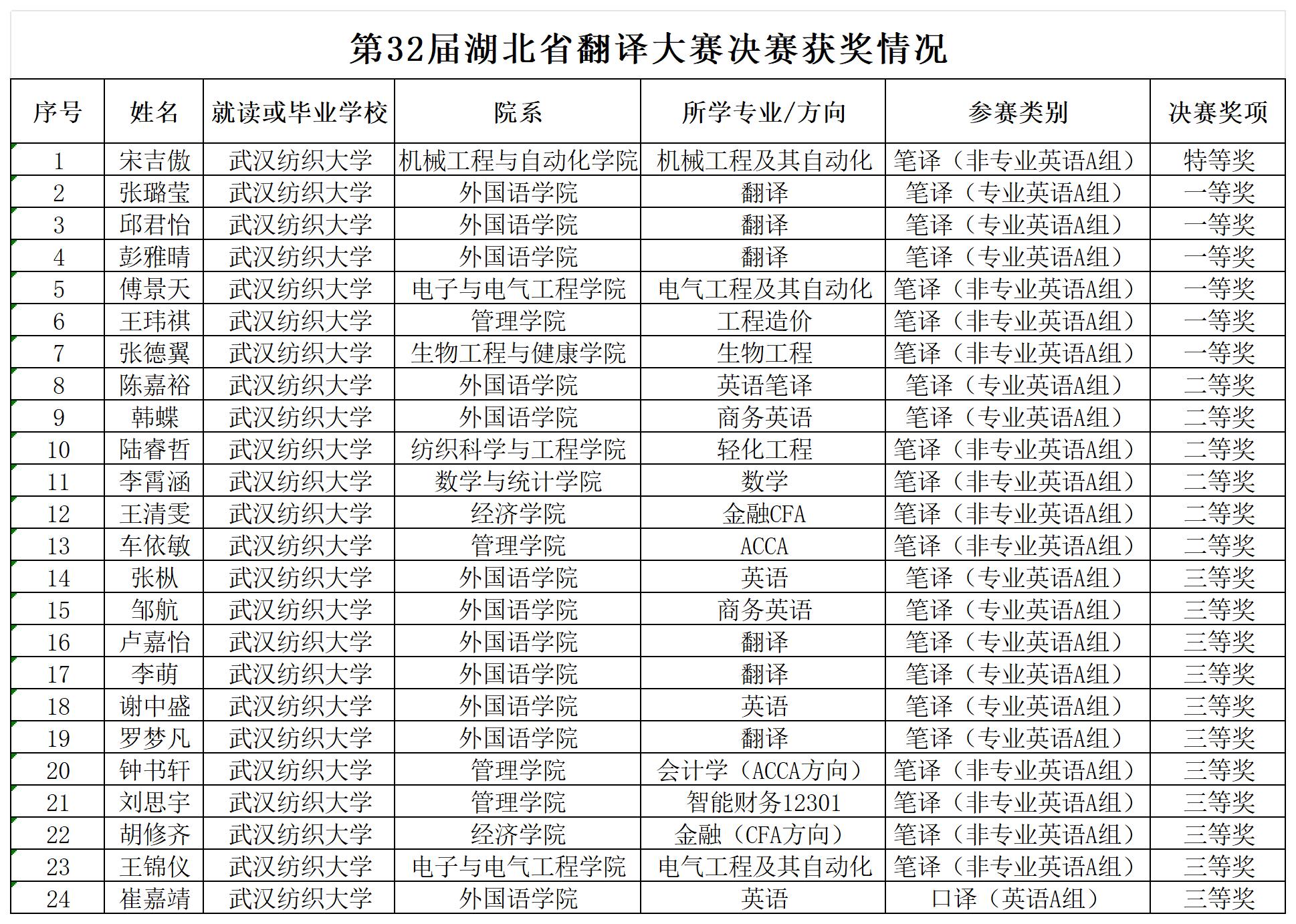 湖北省翻译大赛由湖北省翻译工作者协会和湖北省外事翻译中心联合举办,为湖北省专业、权威的年度翻译类赛事,大赛分为初赛和决赛两个赛程。经过两轮角逐,我校学子在第32届湖北省翻译大赛决赛中获得佳绩,获奖名单如下: