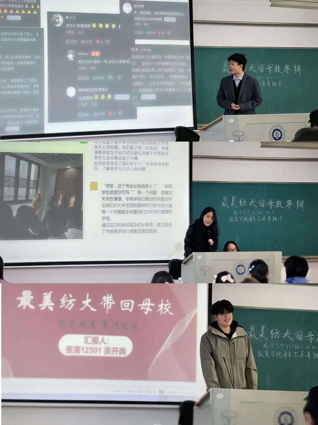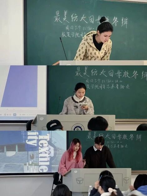 答辩现场,各实践团队与个人依次登台汇报实践成果。同学们结合精心制作的PPT,从母校宣讲、经验分享、互动交流等方面进行细致讲解:有的团队走进高中课堂,讲解纺大专业特色与校园生活;有的学子分享备考经验与大学生活感悟,为学弟学妹们答疑解惑;还有的通过线下交流、线上分享等形式,将“崇真尚美 笃行致远”的纺大校训传递给更多人。
