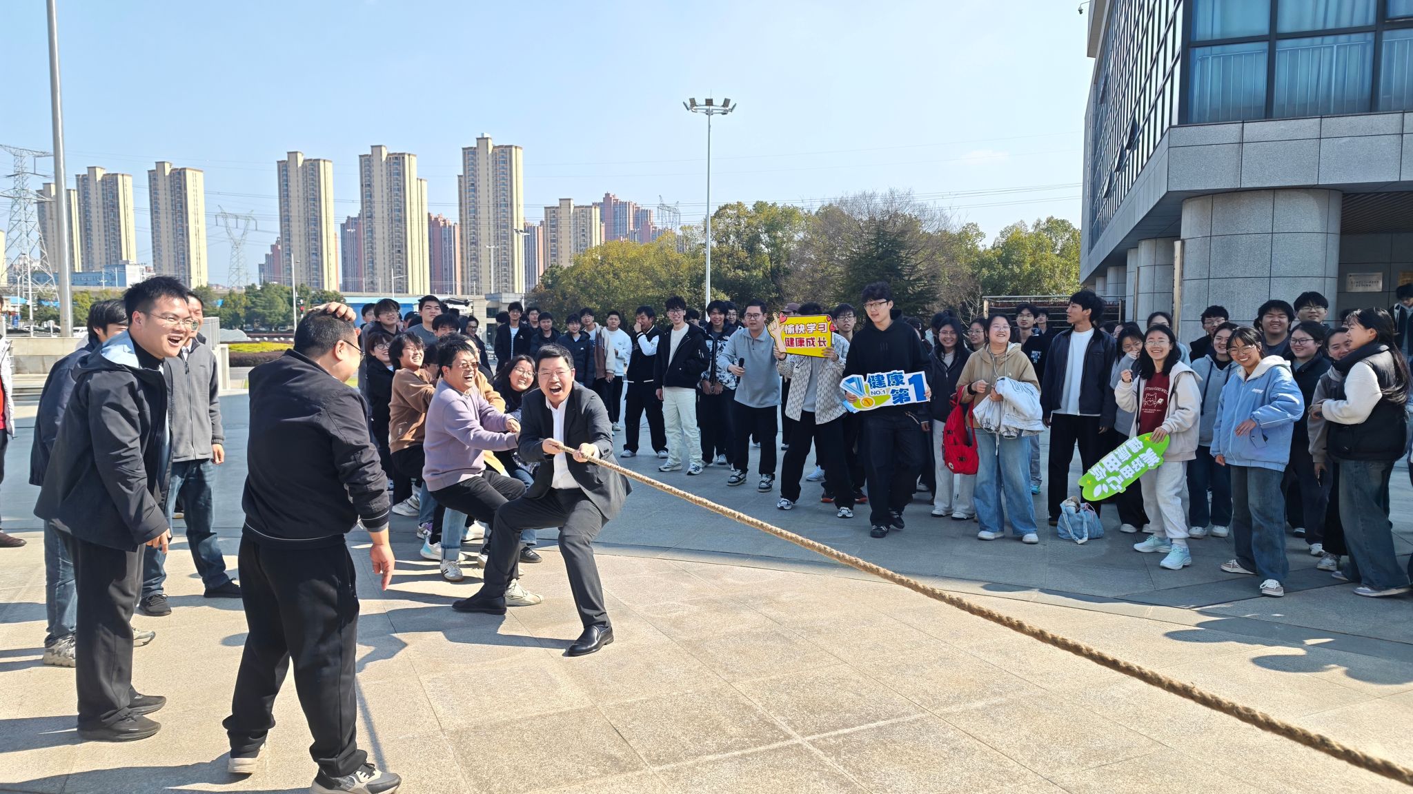 3月12日下午,电子电气学院师生健康文化节在阳光校区崇真广场启动。院党委书记张红鑫、院长刘威出席启动仪式,并在仪式结束后加入师生参赛队伍和“啦啦队”,共同参与拔河项目。