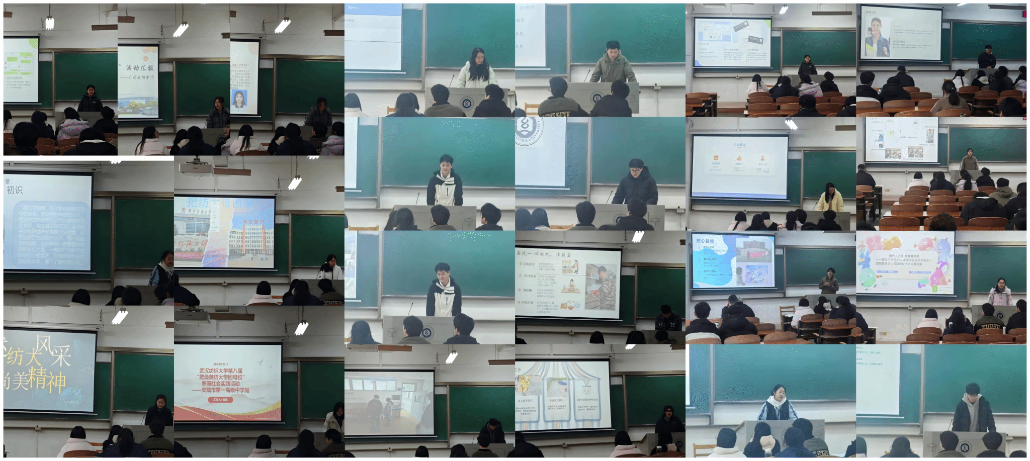 本次寒假社会实践活动形式多样、内容多元。在“把最美纺大带回母校”主题实践中,学院共组织30支团队奔赴湖北、山东、河北、河南等省内外多地重点高中开展回访宣传活动。实践团队通过前期对接沟通,深入高三班级、操场、食堂等场所,以宣讲、座谈、互动问答、合影留念等形式,向学弟学妹们介绍武汉纺织大学的办学特色、专业优势和校园文化,分享大学生活的成长与感悟。活动不仅增强了高中生对纺大的认知与认同,也进一步激发了他们的报考热情。