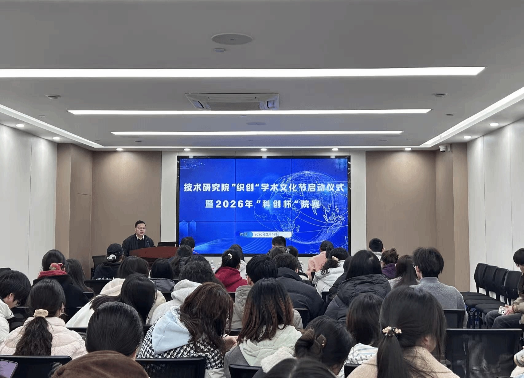 为激发研究生创新意识、提升创新实践能力,落实“以赛促学、以赛促创”理念,营造浓厚的学术文化氛围,技术研究院于2026年3月19日下午在崇真北楼B4010会议室举办“织创”学术文化节启动仪式暨2026年“科创杯”大学生创业计划竞赛院级决赛。校团委副书记杨诗文,技术研究院党委书记涂耀威、党委副书记张辉,以及教育部重点实验室副教授杨丽燕、国家地方联合工程实验室副教授梁子辉、教育部工程中心祇思源老师出席并担任评委。活动由技术研究院党委副书记张辉主持,各参赛团队全体成员、学生代表等参加了本次活动。