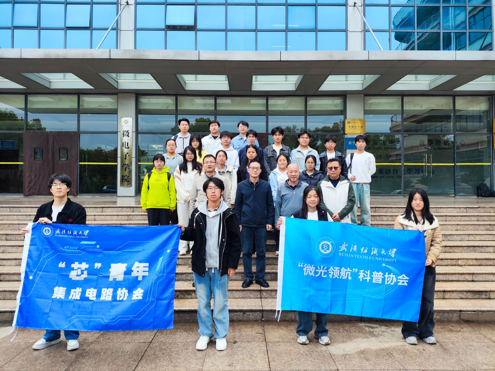 成立仪式在热烈的氛围中圆满结束,与会师生合影留念。两个协会的成立,标志着微电子学院学生学术科创与科普工作迈入新阶段。
