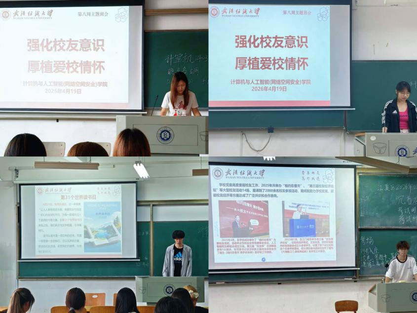 为加深同学们对校友文化的了解,丰富班级课余生活,培养大家的阅读习惯,计算机(网络空间安全)学院于4月19日召开了“强化校友意识,厚植爱校情怀”主题班会。此次班会向大家分享了优秀校友的故事,以及校友为母校发展做出的点滴贡献,让同学们对校友文化有了更清晰的认识。