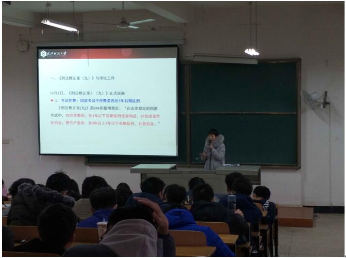 辅导员宋静组织17级全体学生认真学习了《武汉纺织大学学生手册(2018年版)》和2015年11月1日正式实施的《刑法修正案(九)》中关于考试作弊入刑的有关条款,详细解读了相关规定,让大家认识到应该养成良好的行为习惯,注意宿舍安全文明,同学交往文明有礼,考试中重视考风考纪,坚决杜绝各类违纪行为的发生。