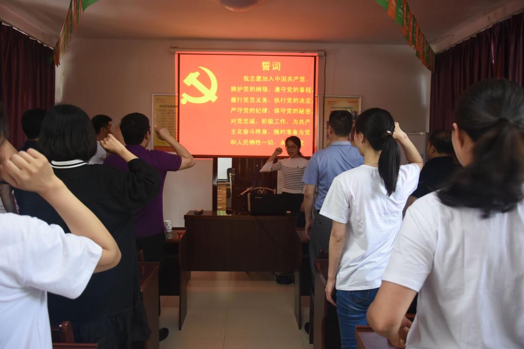 全体人员起立,面对鲜红的党旗,重温入党誓词,庄严宣誓,接受一次党性的洗礼,重温一次入党誓词,诵读一段党章,上一次特色党课。