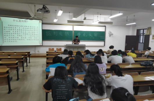 5月21日,环境学院在崇礼楼开展以“净化校园 净化校园”为主题的打击传销进校园现场宣传活动,由各辅导员宣讲。使广大学生认清传销的违法犯罪性质、欺诈本质和严重危害。