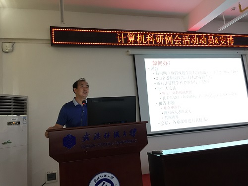 副院长何儒汉对此次活动进行了动员,从”为什么要办这个活动”、”如何办这个活动”和”今天的安排”这三个方面进行了阐述,从现状分析、外因和内因等方面指出科研的重要性和必要性;进而对科研例会活动进行了具体安排,要求计算机各系部定期定点开展科研例会活动,初步拟定了科研例会报告人员顺次表;最后对今天的第一次科研例会活动进行了安排。