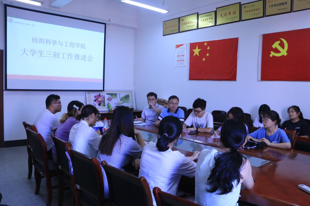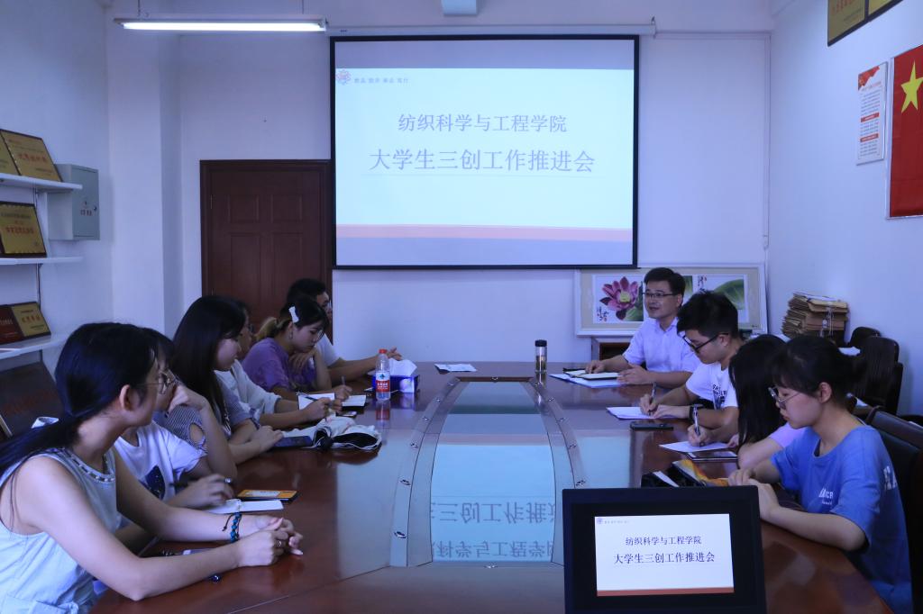 9月5日下午,纺织学院大学生“三创”工作推进会在崇实楼H504会议室召开。院党委副书记汪仕辉、副院长蔡光明、2019年度大学生“三创”项目负责人、“三创”中心工作员参加了会议。