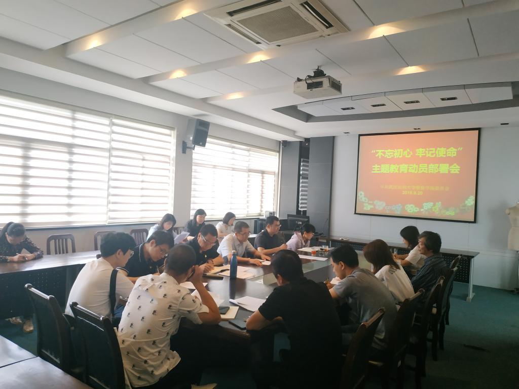 会上,熊兆飞传达了学校主题教育学习方案布置会精神,详细解读了《中共武汉纺织大学服装学院委员会“不忘初心、牢记使命”主题教育实施方案》,希望全院党员干部把开展“不忘初心、牢记使命”主题教育作为当前一项重大政治任务,切实增强“四个意识”、坚定“四个自信”、做到“两个维护”,自觉将思想和行动统一到中央、省委和学校的部署和要求上来。