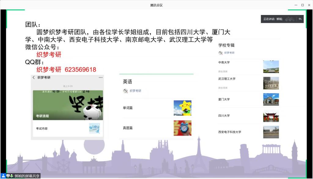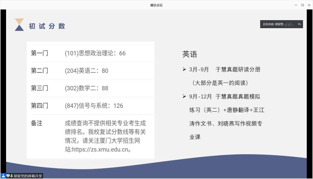 成功上岸厦门大学的的郑亚楠在讲座中额外提醒同学们在备考期间要保持一颗平常心,即便是在家备考也要早睡早起,细化每日的考研目标。她说:考研是一个漫长的过程,唯有坚持、勤奋和不放弃才能离梦想更近一点。同时,也为大家提供了一些调剂的常识,以备不时之需。