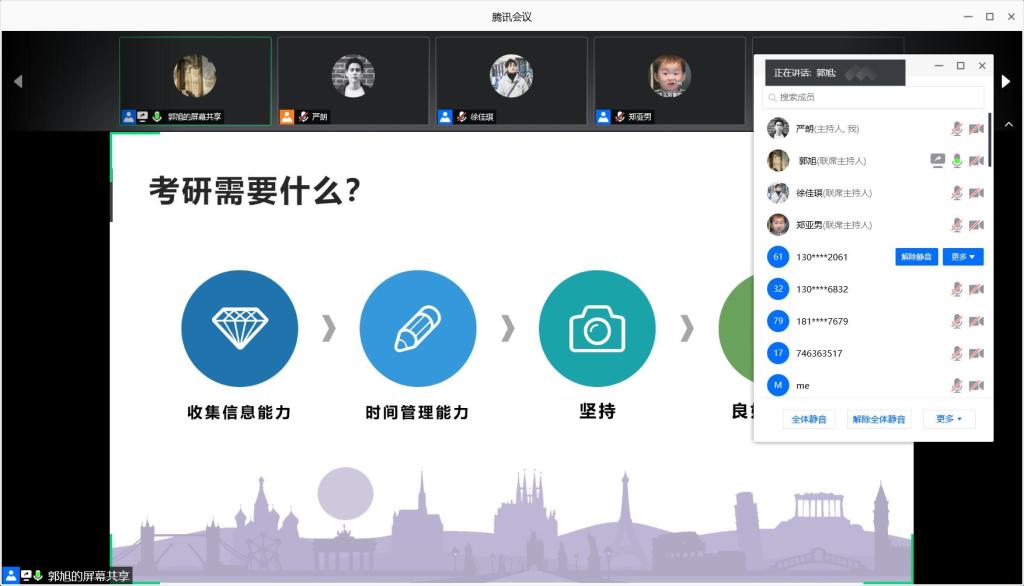 为了让同学们对考研有更加深入的了解,帮助同学们明确复习规划,增强考研信心,电子电气学院于6月20日下午开展“云”上考研朋辈领航讲座。此次讲座特邀请2016级考研达人徐佳琪、郭旭和郑亚楠做经验分享,2017级有考研意向的同学参与此次讲座。