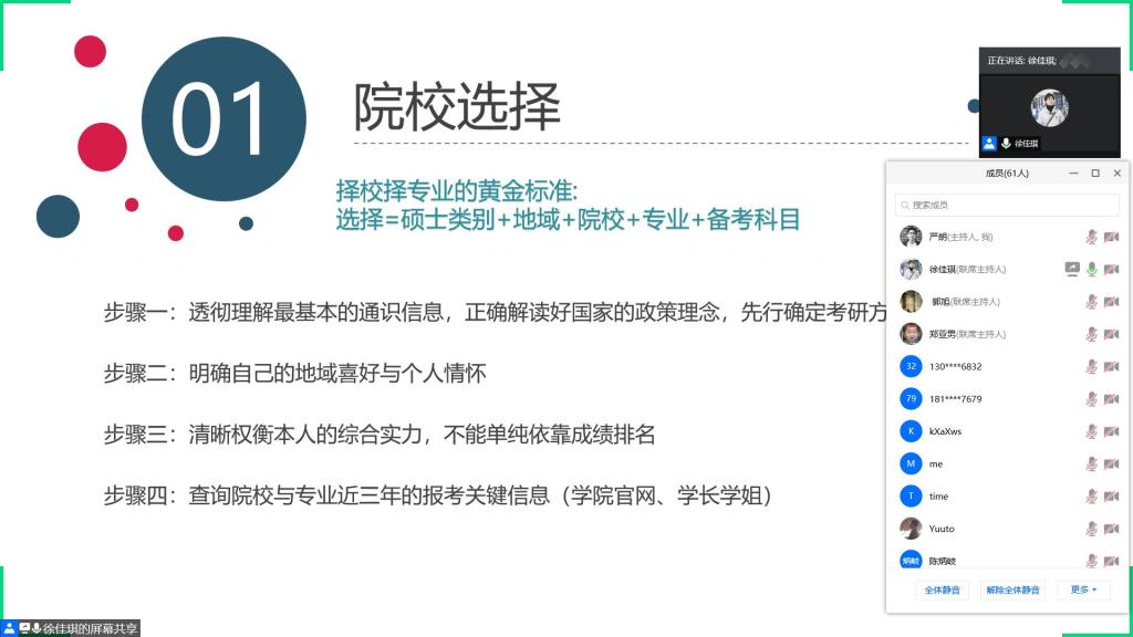 会议伊始,考取武汉理工大学的徐佳琪就考研目标院校和专业的选择进行了经验分享,她谈到:在明确考研方向后,要清晰权衡本人的综合实力,不可单纯靠排名和个人喜好来选择目标学校,同时一定要关注学校和专业近三年来的报考信息,做到知己知彼。