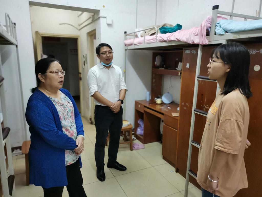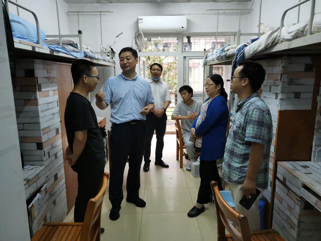 20级辅导员向学院领导介绍了新生宿舍的分布情况。在宿舍,刘韦分别仔细查看了宿舍设施,提醒同学们防盗防骗,如有问题及时与宿管和后勤部门反馈。