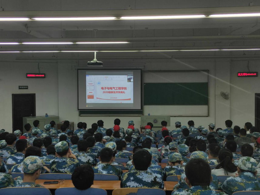 开学典礼在国歌声中拉开序幕。电子电气学院副院长许明耀代表学院致辞。他首先向全体2020级新同学的到来表示热烈的欢迎和衷心的祝贺,并向辛勤培育他们的家长致以深深的敬意和诚挚的问候。他从要抱定宗旨,坚定爱国信念;博学慎思,放眼世界;坚毅执着,不畏艰难挫折三个方面对学生提出了具体要求。他希望大家以更加宽广的视野、扎实的基础、渊博的学识,投身促进人类社会发展的进程,成为继往开来、引领未来和建设未来的人才。他鼓励同学们即使身处逆境,也要始终保持坚定不移的信念和战胜困难的勇气,在顺境中不浮躁,遇到挫折不消沉,乐观向上,勇往直前,才能学有所成、学成大器。