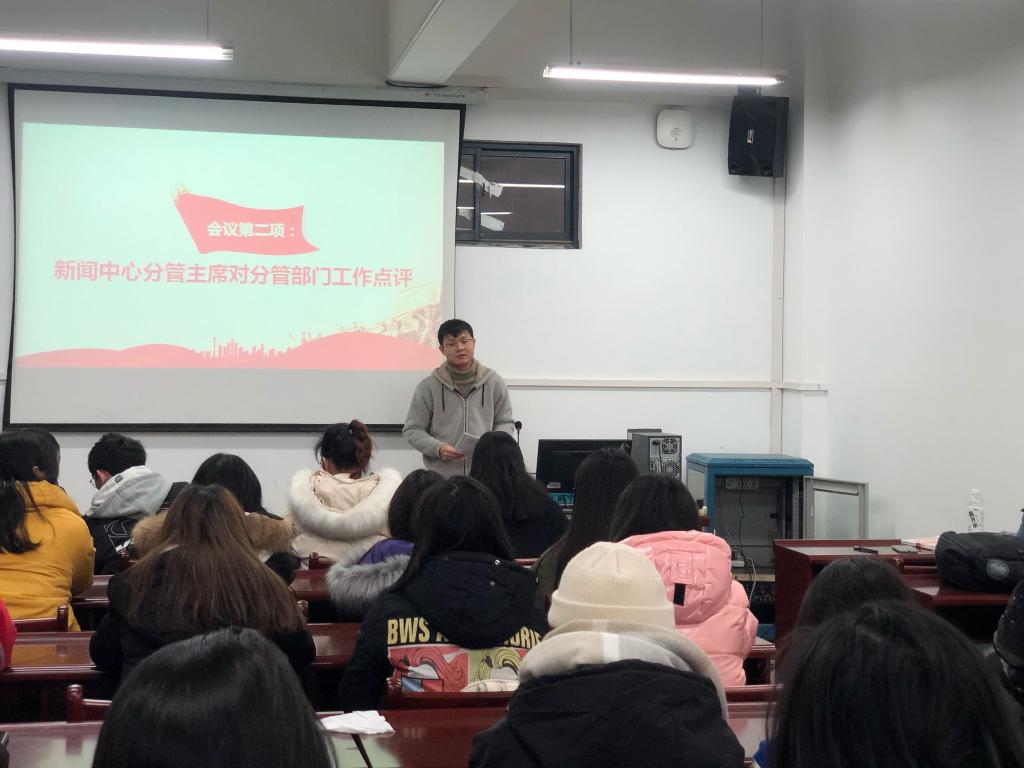 新闻中心主席团成员对各分管部门工作进行了点评,并提出了意见建议。新闻中心主席谢雨娟对中心成立三个月以来的工作情况进行了总结。兼职辅导员汪伦结合自身学生干部经历分享了自己对于学生工作和宣传工作的认识体会,他表示作为学生干部要“明确角色身份,聚焦主责主业;充分运用平台,实现个人价值;珍惜大好时光,充实提高自我”,希望大家在担当责任中磨砺自己,在无私奉献中升华自己,脚踏实地,仰望星空,不忘初心,才能方得始终。