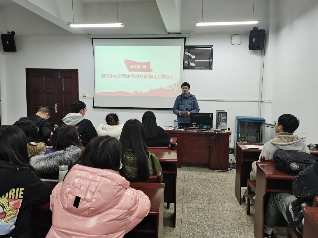 会上,学院新闻中心采编部、办公室、摄制部、新媒体部、文创部及“金话筒”网评工作室相关负责人分别围绕“部门简况、创新亮点、工作成效、存在问题、改进计划”等五个方面进行了交流汇报。