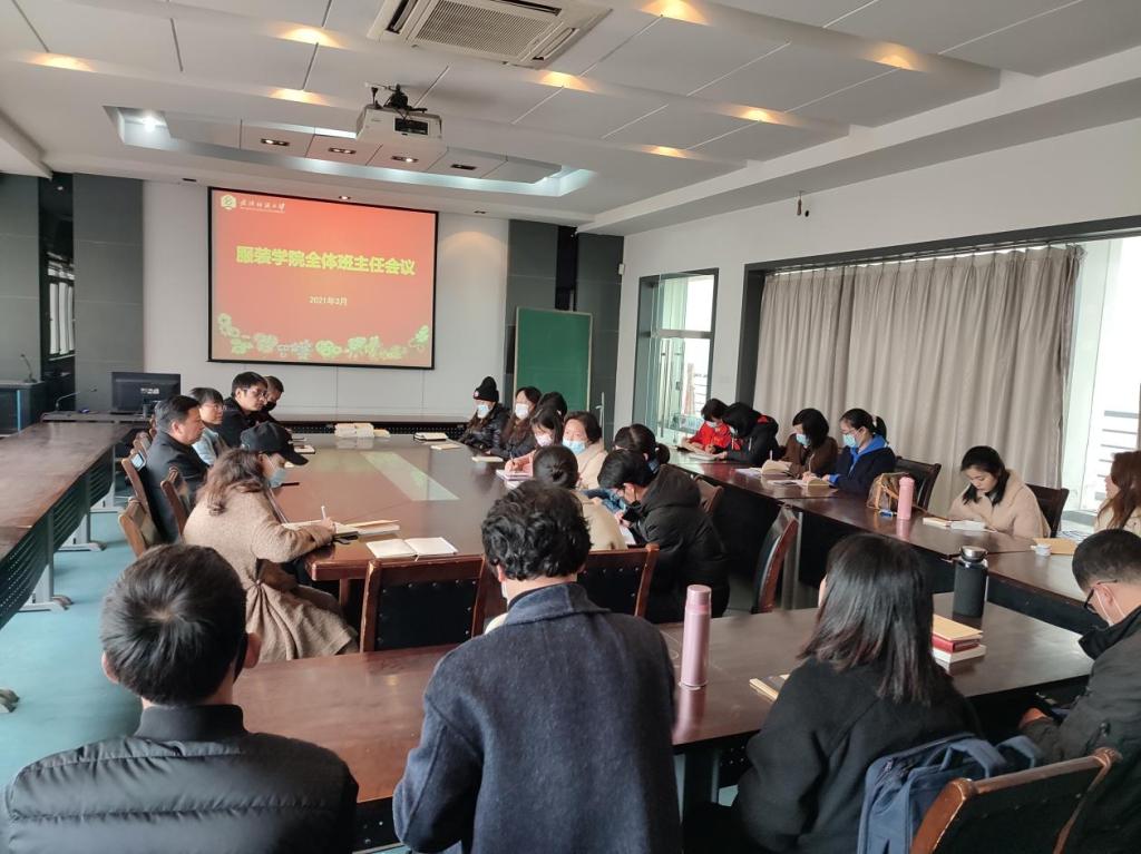 3月11日下午,服装学院在南湖校区尚知楼三楼会议室召开新学期班主任培训交流会议。服装学院院长陶辉,副院长袁大鹏、江学为,党委副书记黄勇及全体辅导员、班主任参加会议。
