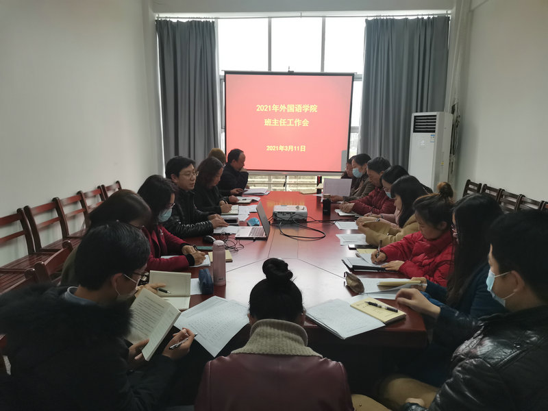 3月11日下午,外语学院在崇文楼313会议室召开2021年班主任工作会议,学院党委书记胡中原,副院长柯群胜、罗绮伦,副书记王芳及各班级班主任参加会议。