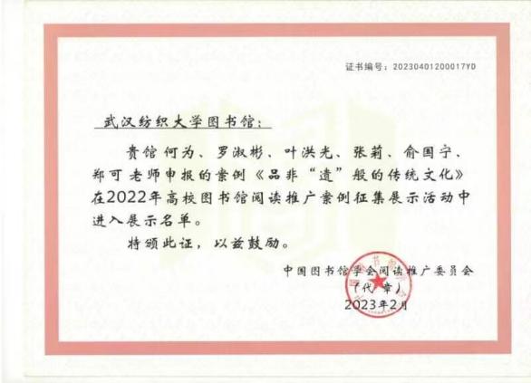 另从中国图书馆协会获悉,我馆《品非“遗”般的传统文化》在2022年高校图书馆阅读推广案例征集展示活动中进入展示名单。“阅读启智书香润心”馆长导读视频展示活动中,我馆提交的《必然》导读,进入“2022年度馆长导读视频”展示名单。