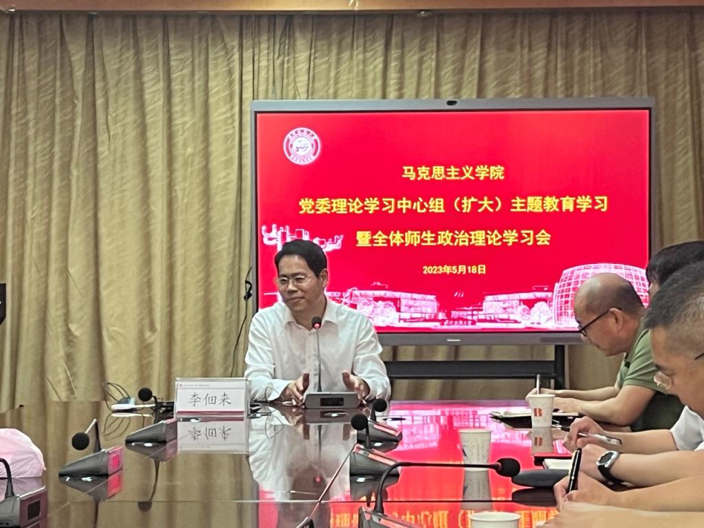 为深入开展学习贯彻习近平新时代中国特色社会主义思想主题教育,提升院党委中心组及全体马院师生政治理论水平,5月18日上午,马克思主义学院邀请武汉大学李佃来教授以“马克思对现代化的重建与中国式现代化的开展”作专题讲座,马克思主义学院党委中心组全体成员及全体师生参加政治理论学习,学习会由学院党委书记武猛主持。