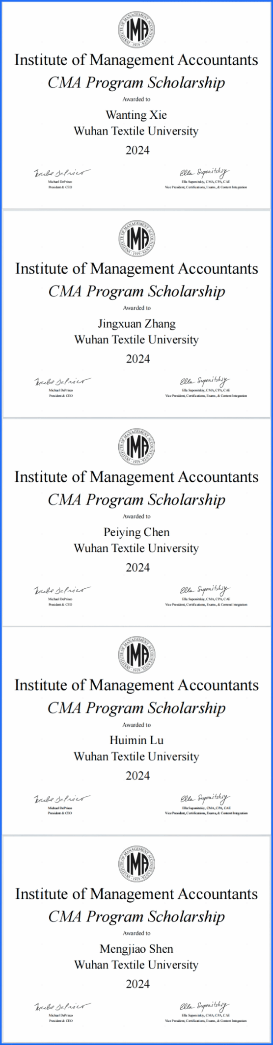 2024年1月,会计学院2020级财务管理专业(CMA方向班)谢婉婷和2021级财务管理专业(CMA方向班)陈沛滢、卢慧敏、沈梦娇、张婧轩5位同学荣获IMA协会CMA奖学金,CMA奖学金等值金额约6000元人民币,这些荣誉既是对学子们学习成绩的肯定,更是对低年级同学们的鞭策与鼓励。