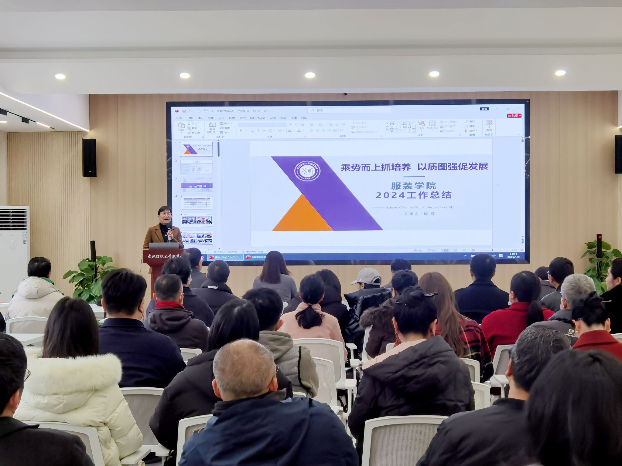 会上,院长陶辉作了《乘势而上抓培养,以质图强促发展》主题工作报告,报告围绕2024年学院工作内容回顾、问题查摆、年终分配和发展方向等内容展开。陶辉重点介绍了学院2024年党建工作、学科建设、人才培养、科研工作、国际合作和招生就业等六个方面取得的成绩及努力的方向。陶辉指出,2025年,学院将围绕“学校特色推进一流学科建设”“通过加强学科交叉推进博士点建设”“聚焦国家需求推进平台与团队建设”“持续改进专业建设促进高质量发展”“通过‘走出去、引进来’推进招生就业质量”五大工作思路,着力实施“紧密围绕‘改革、双轮驱动、学校特色’,对标国家学科评估指标,推进一流学科建设”“通过加强前沿科技与时尚设计融合,以‘严、真、实’推进博士点建设”“通过国家一流专业建设、工程认证持续改进,推进人才培养高质量发展”“精准分析并走进生源地、拓宽就业渠道,推进招生就业质量”“坚持开放、合作和包容的办学态度,推进学院各项工作全面发展”五大重点工作举措,锚定“双一流”建设目标,凝聚推动发展强大合力,开创学院高质量发展新局面。