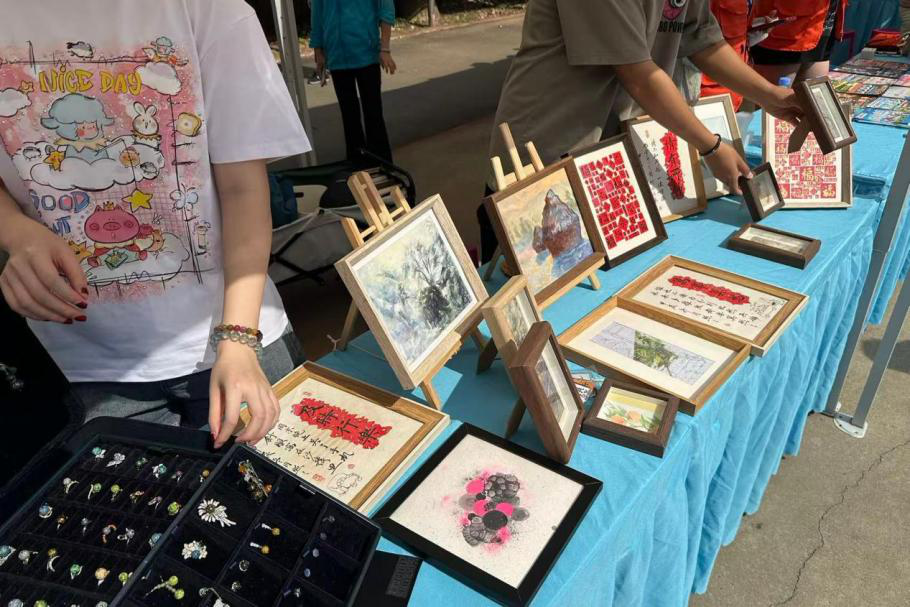 居民穿梭于各摊位,赏画作、与创作者交流非遗文化。同学们的才华与热情感染众人,现场气氛热烈。有居民赞叹,这些作品充满青春创意,在家门口购得大学生原创作品颇具纪念意义。