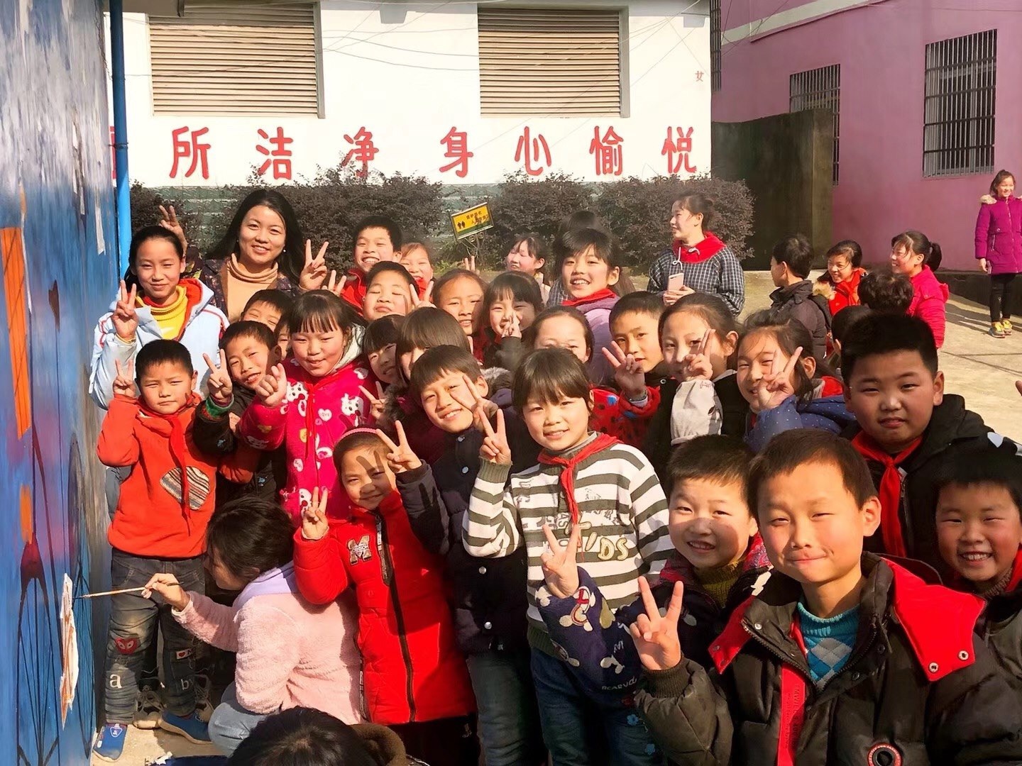 2019年刘凡与蕲春王要小学同学在新绘制的文化墙前合影